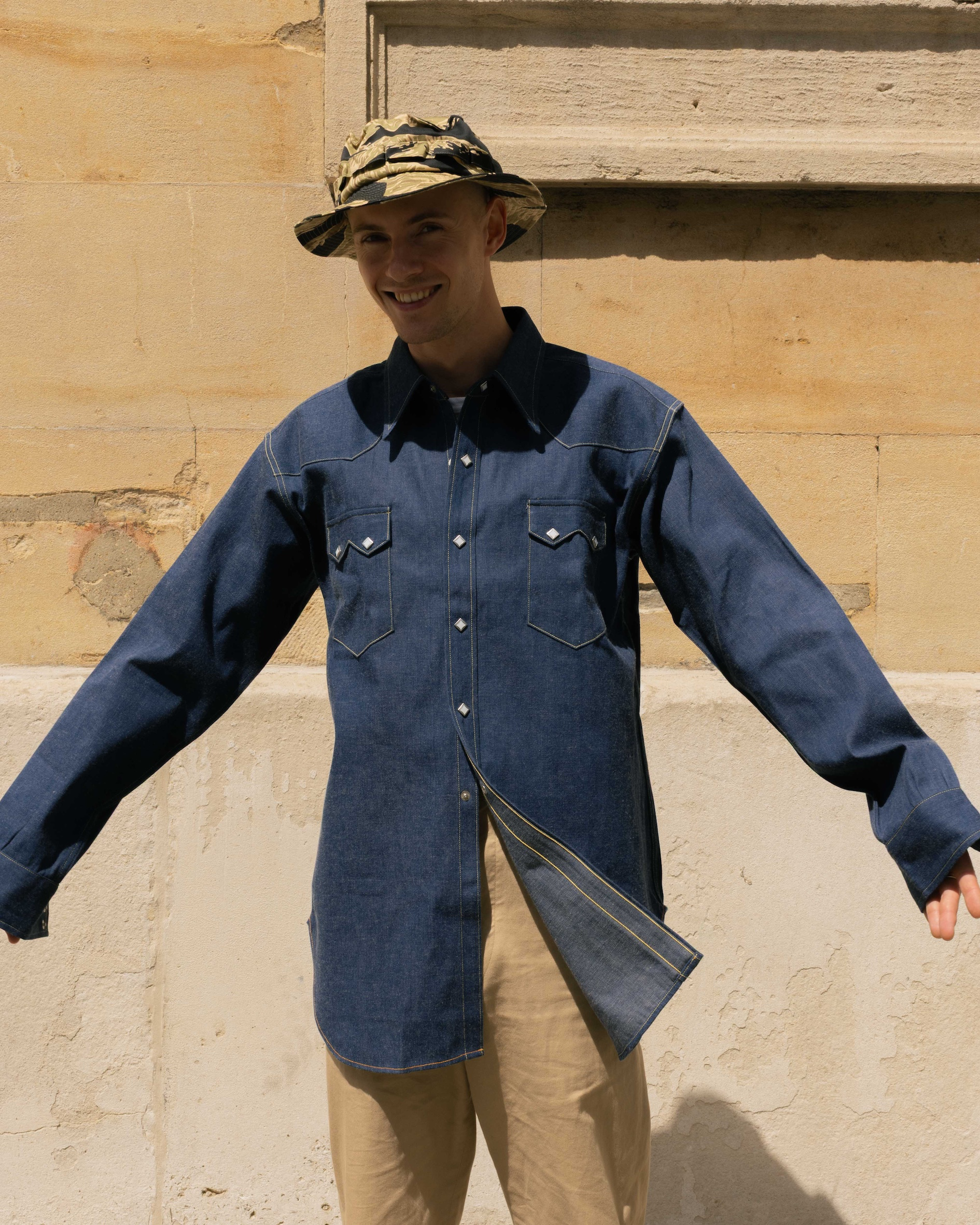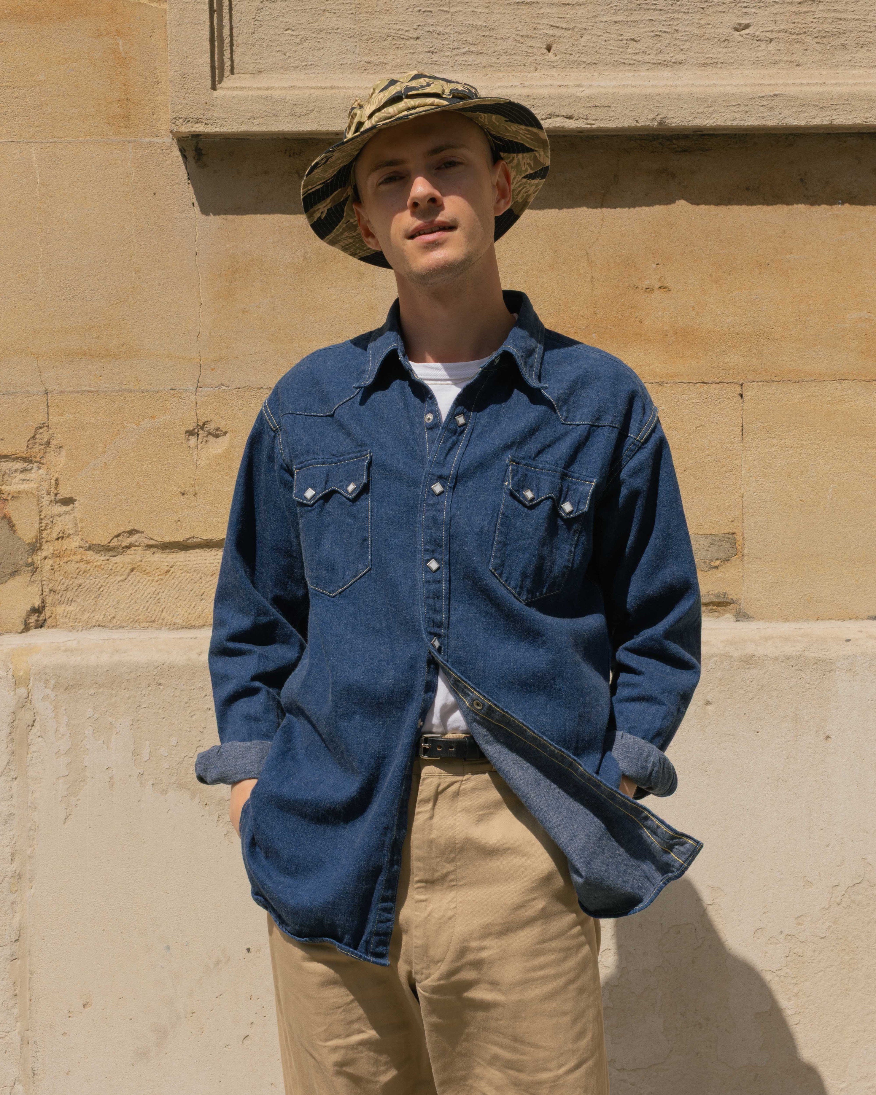 Falling under their Joe McCoy line, this Denim Western Shirt draws inspiration from 1960’s styles. The denim has been specially woven using layered lighter-coloured yarns to produce a pale indigo hue, authentically capturing the look of that era. Crafted from a 10 oz denim in Japan.