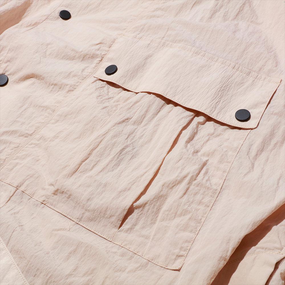 Cut in Japan from 100% taffeta nylon, a fabric made from natural fibres that can absorb moisture. The nylon features fine crinkles throughout and has been through an Ibuki dyeing process. The Coat also features a large single chest pocket with snap button and two slash pockets as well as a belted waist to aid fit. It has a two-way closure with standard button closure as well as snap button closure & snap button cuffs. Lightweight and a one-piece construction has been paired with a relaxed fit.