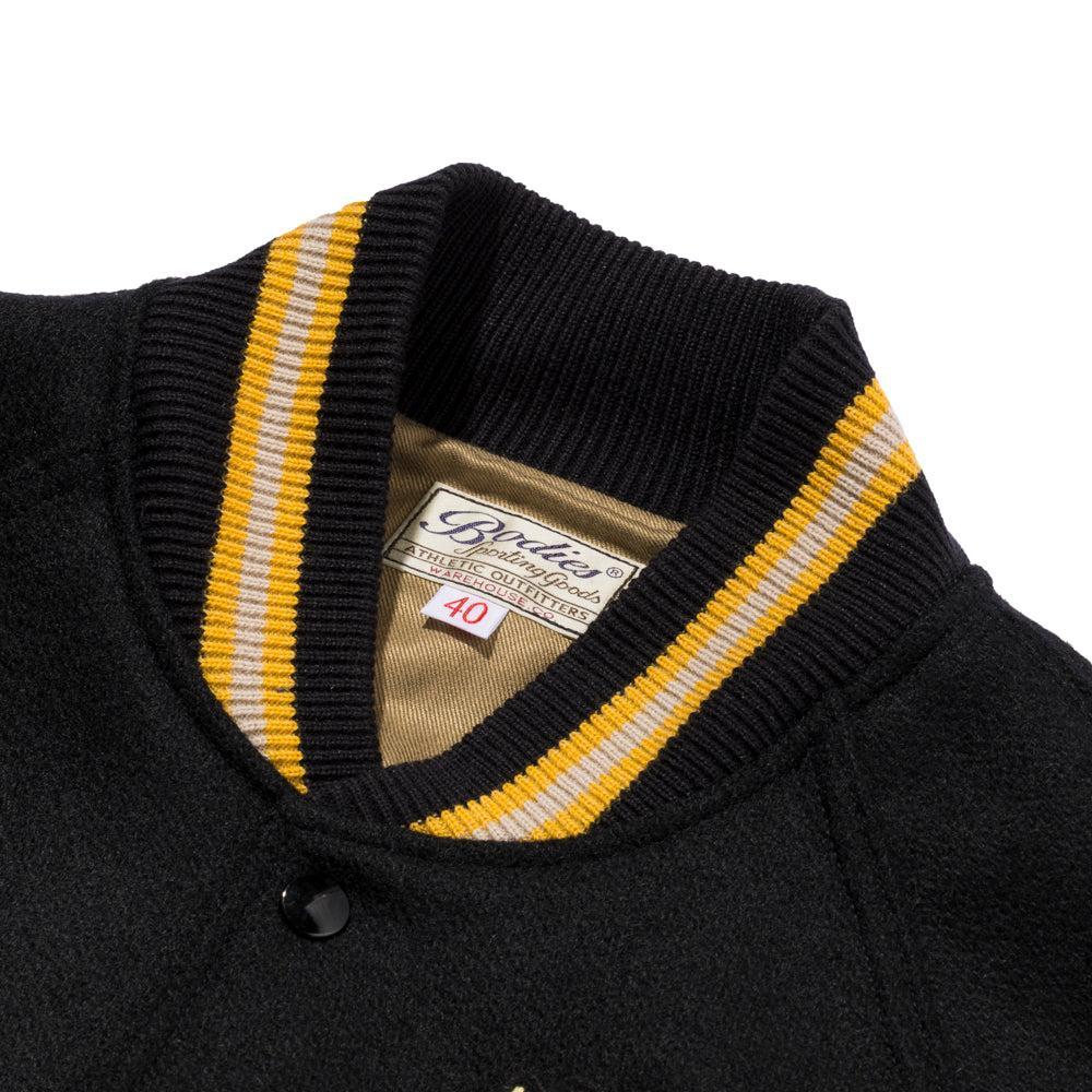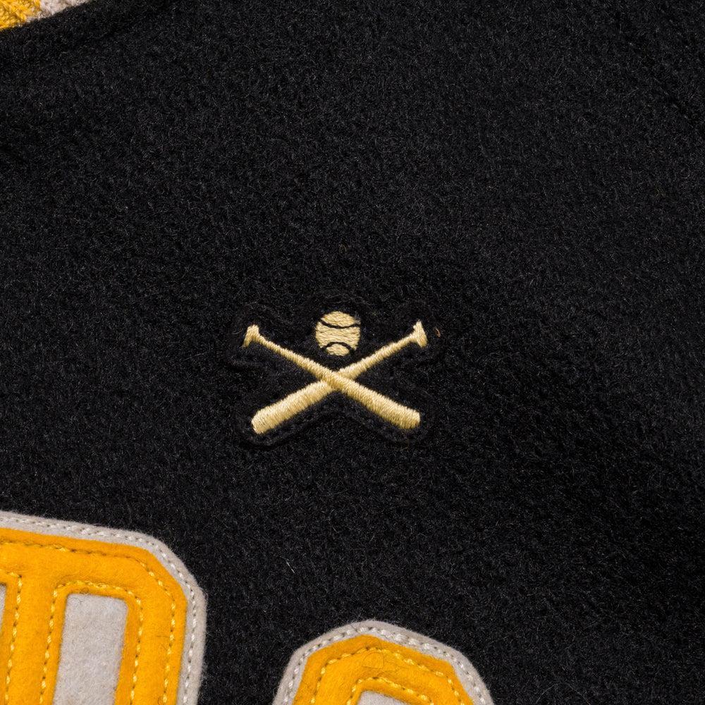 Cut in Japan from 100% melton wool, the Lot. 2239 varsity jacket features felt West Point lettering across the chest, showcasing their signature two-tone yellow and black colour-way, that also features on the waistband, cuffs & collar. It’s lined with soft cotton-rayon twill for comfort, while two slash pockets trimmed in leather add durability. Finished with a snap-button front, A-1 style collar, ribbed waistband and cuffs, and an embroidered baseball motif on the chest. Finished with woven 'Bodies Sporting Goods' Label.