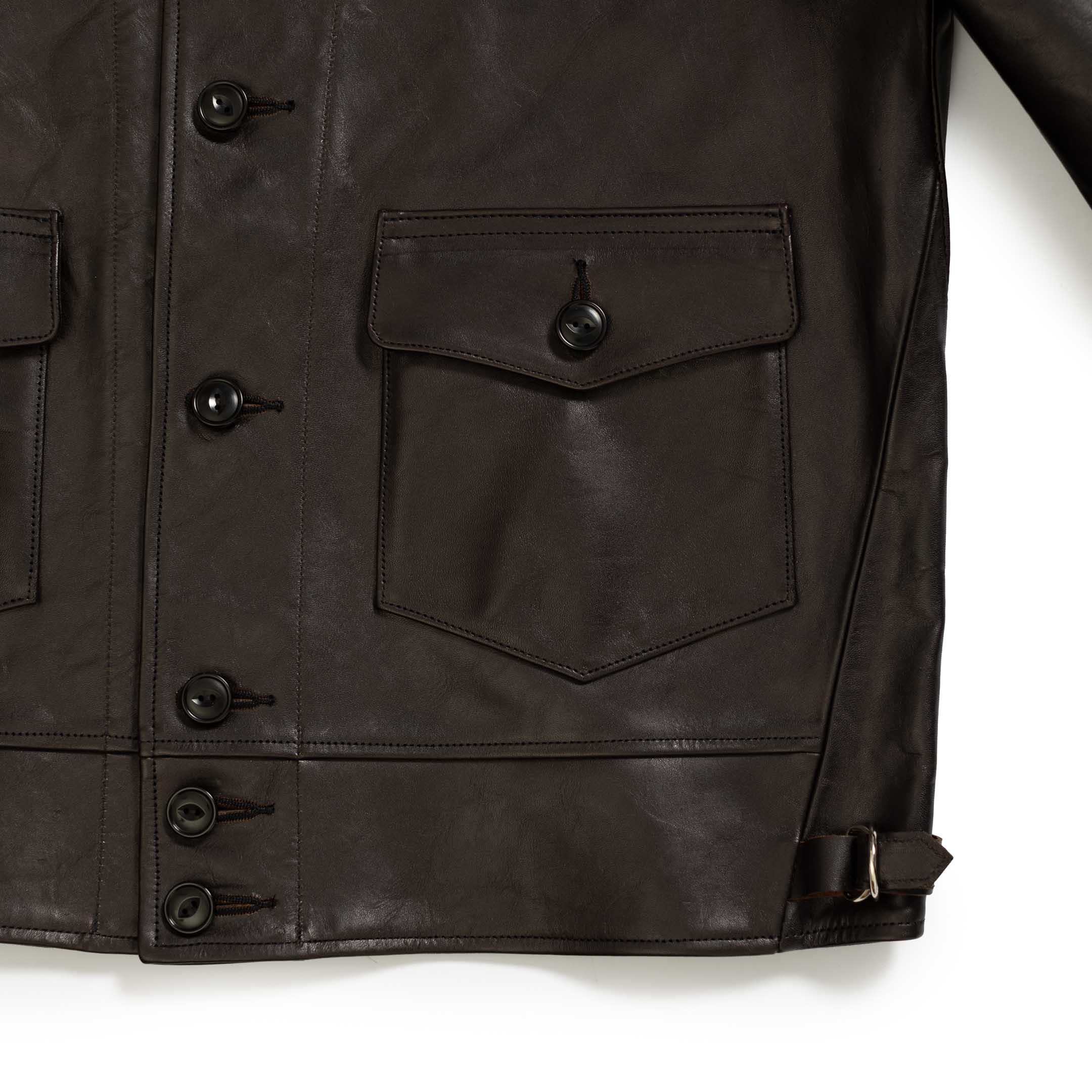 Each jacket is hand-stitched in their Tokyo studio with great skill, using a fine stitch-count which is extremely hard to achieve on leather manufacturing. The Joseph has been produced with the same sewing techniques as seen on vintage leather jackets to enhance the puckering through the seams creating wonderful, subtle areas of character that run through each garment.