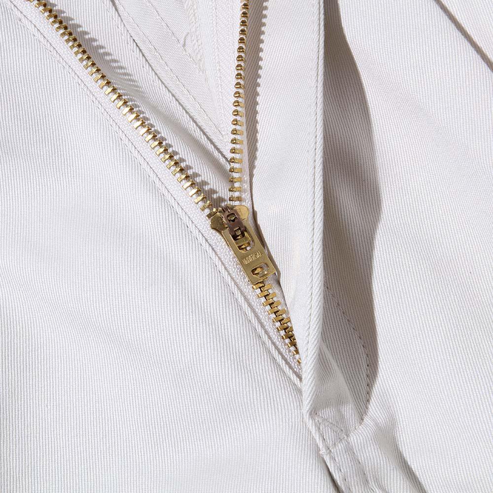 Cut in Japan from a high density cotton chino cloth, the Peg Top trousers feature a high rise with a roomy top block and slight taper towards the hem. Two slash pockets have been paired with two rear pockets while one has a button closure. Front facing pleats have been paired with a zip fly and snap button closure on the waistband. Finished with a woven Yankshire label.